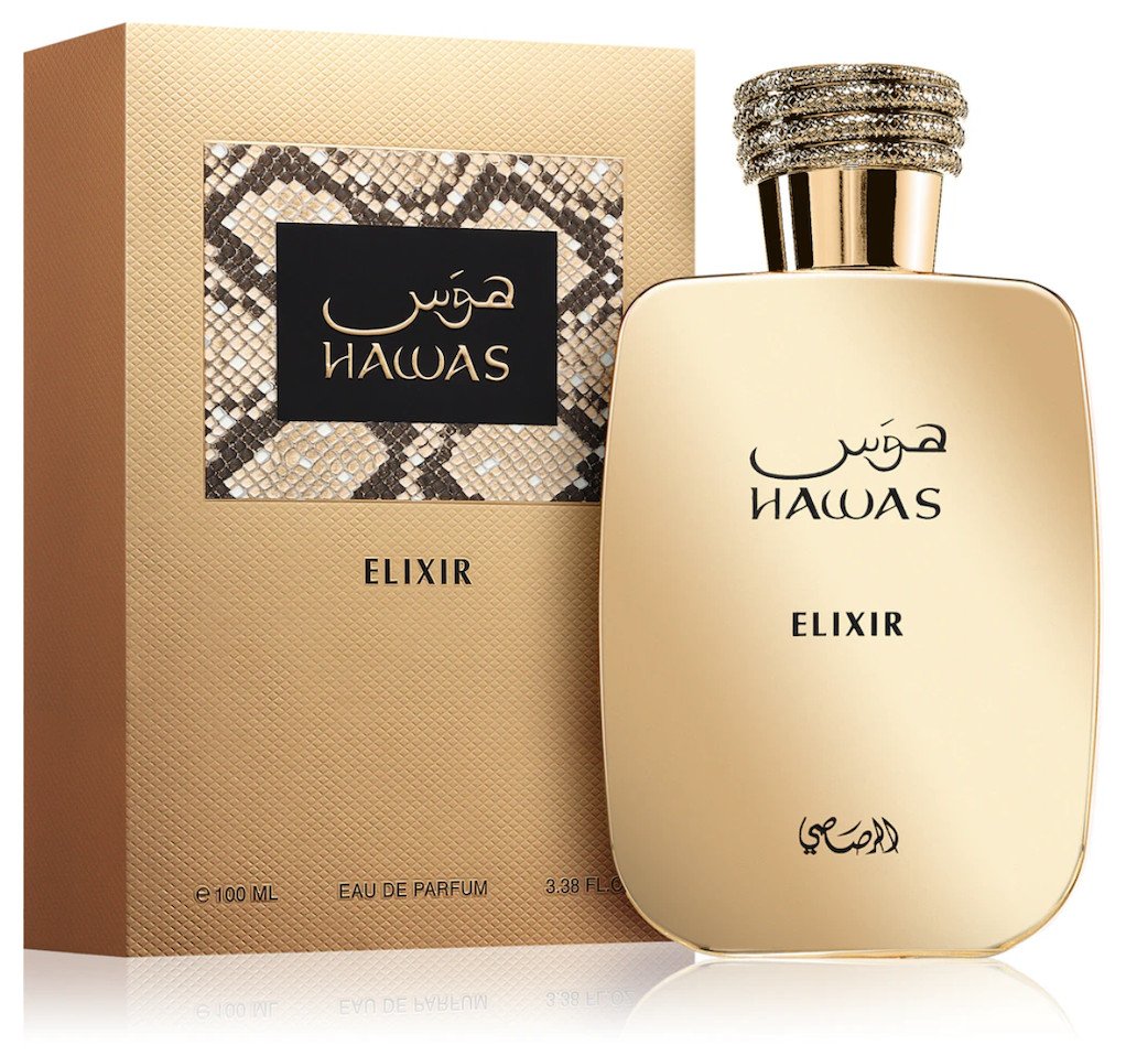 Hawas Elixir de Rasasi es una fragancia de la familia olfativa Oriental Vainilla para Hombres. Esta fragrancia es nueva. Hawas Elixir se lanzó en 2024. Las Notas de Salida son menta, bergamota y abrótano; las Notas de Corazón son chocolate oscuro, lavanda y benjuí; las Notas de Fondo son vainilla, haba tonka y almizcle blanco.
