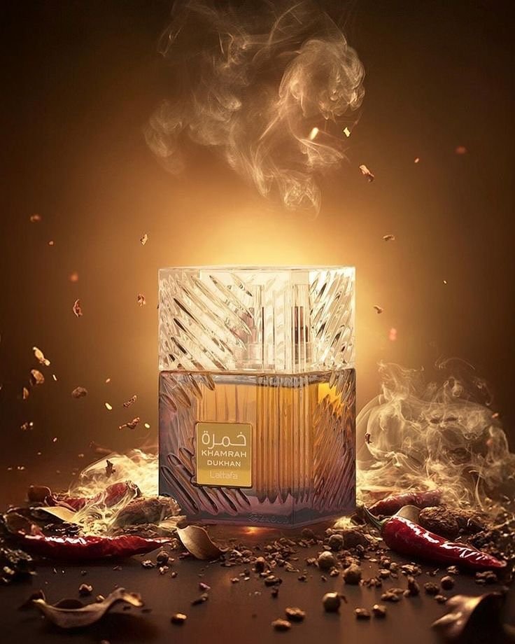 Khamrah Dukhan de Lattafa Perfumes es una fragancia de la familia olfativa Oriental para Hombres y Mujeres. Khamrah Dukhan se lanzó en 2025. Las Notas de Salida son especias, pimienta de Jamaica y mandarina; las Notas de Corazón son incienso, ládano, flor de azahar del naranjo y pachulí; las Notas de Fondo son praliné, tabaco, ámbar, haba tonka y benjuí.