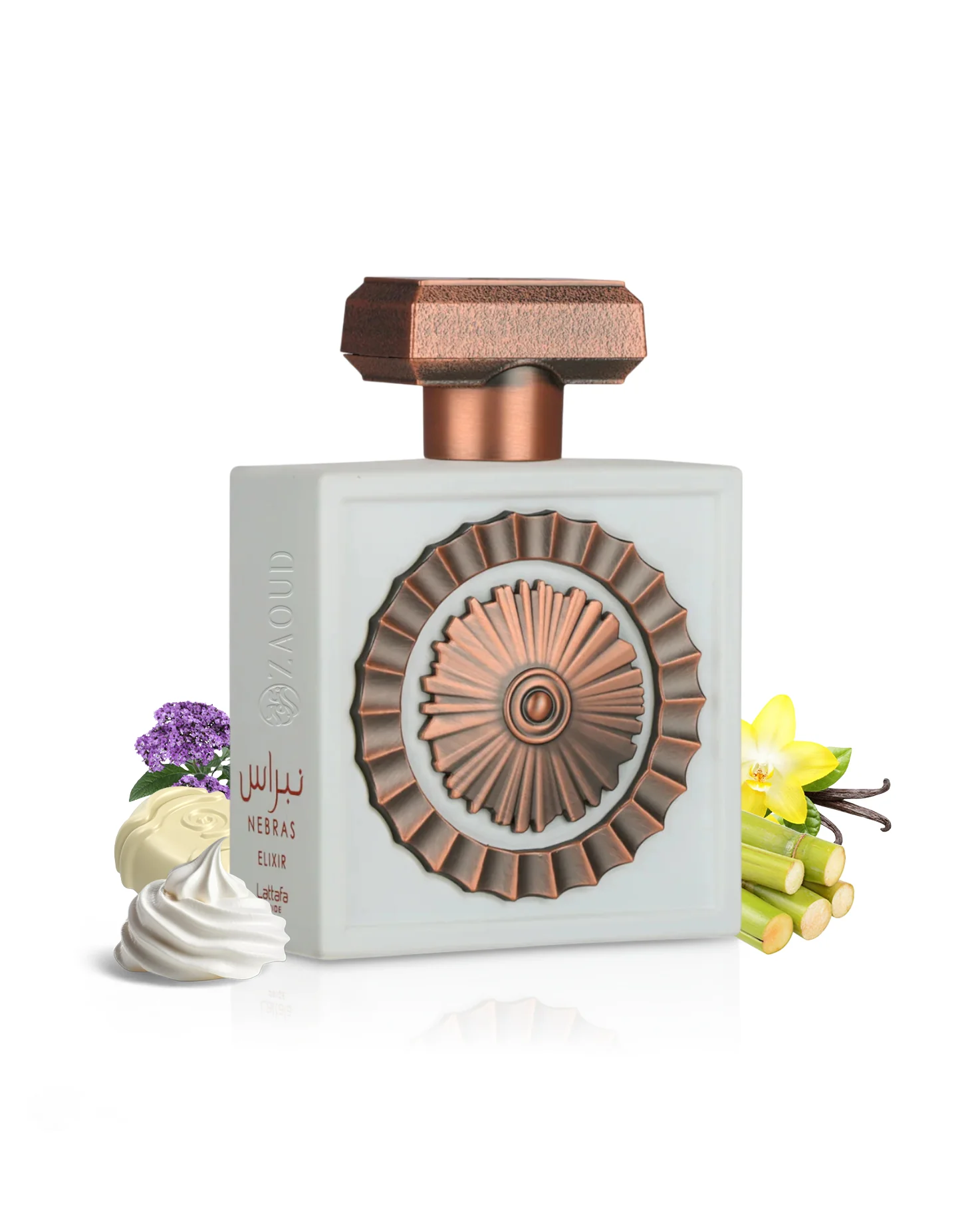 Nebras Elixir de Lattafa Perfumes es una fragancia de la familia olfativa Oriental Vainilla para Hombres y Mujeres. Esta fragrancia es nueva. Nebras Elixir se lanzó en 2025. La Nariz detrás de esta fragrancia es Nanako Ogi. Las Notas de Salida son Caramelo de leche y crema batida; las Notas de Corazón son caña de azúcar y heliotropo; las Notas de Fondo son vainilla, ambroxan y almizcle.