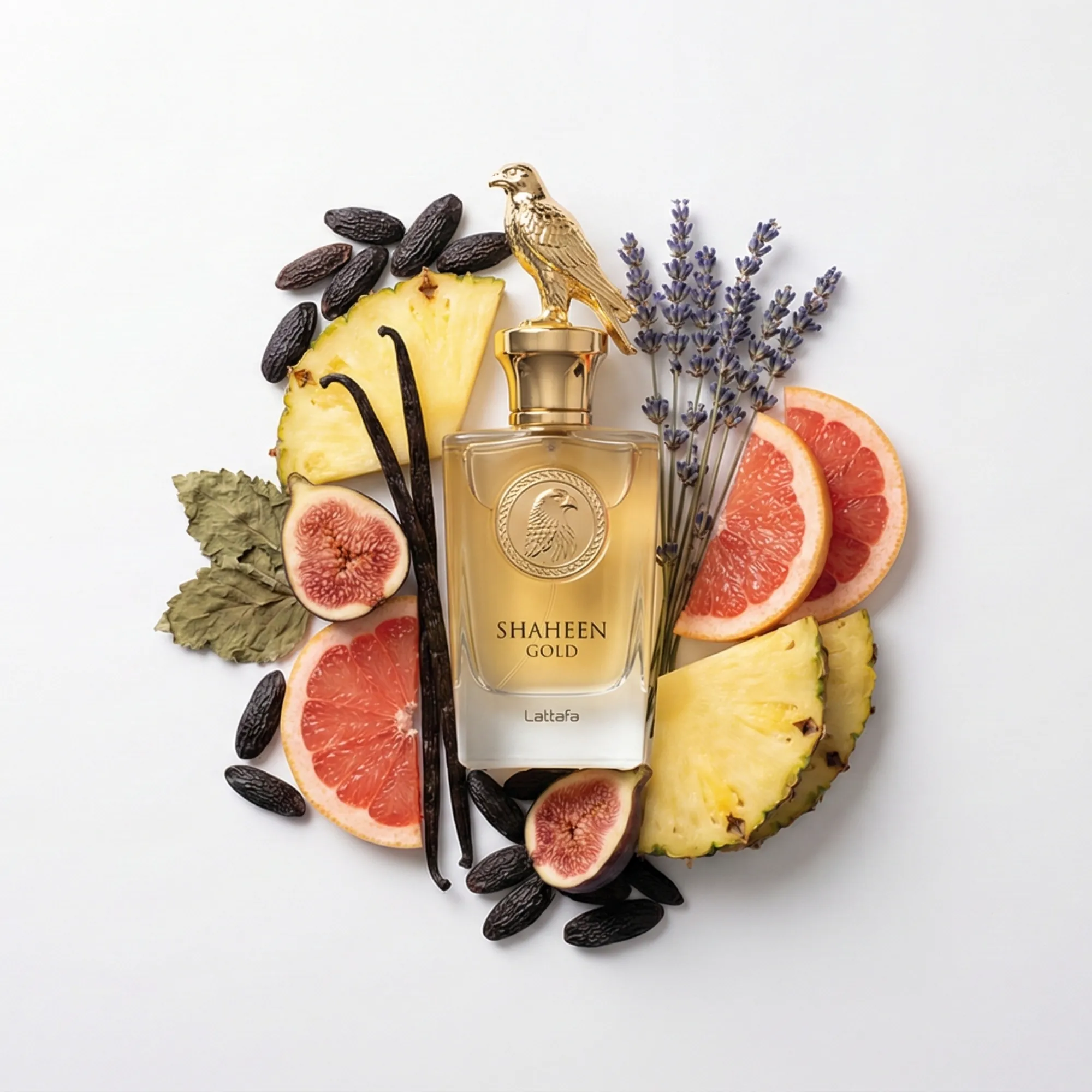Shaheen Gold de Lattafa Perfumes es una fragancia de la familia olfativa para Hombres y Mujeres. Shaheen Gold se lanzó en 2022. Las Notas de Salida son piña y toronja (pomelo); las Notas de Corazón son higo y lavanda; las Notas de Fondo son vainilla, pachulí y haba tonka.