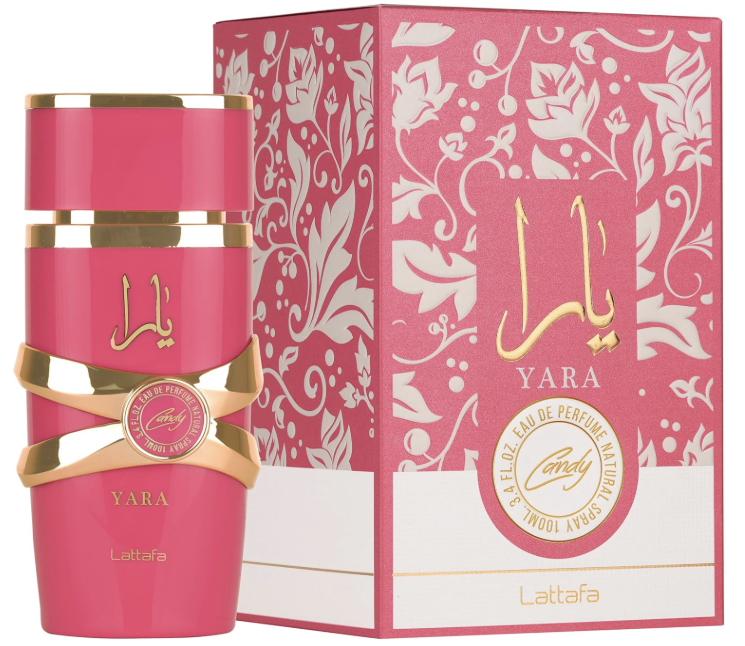 Yara Candy de Lattafa Perfumes es una fragancia de la familia olfativa Floral Frutal Gourmand para Mujeres. Esta fragrancia es nueva. Yara Candy se lanzó en 2024. Las Notas de Salida son grosellas negras y Mandarina verde; las Notas de Corazón son Caramelo de fresa efervescente y gardenia; las Notas de Fondo son vainilla, almizcle, ámbar y sándalo.